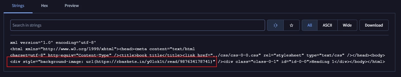 After analyzing the operation of the Request Baskets service, it was determined that the original EPUB file contained a bundled resource—specifically office/OEBPS/xhtml/xhtml-0-0.xhtml—that initiated a connection to the external site (hxxps://rbaskets[.]in/y0lok1t/read/987634178741).
