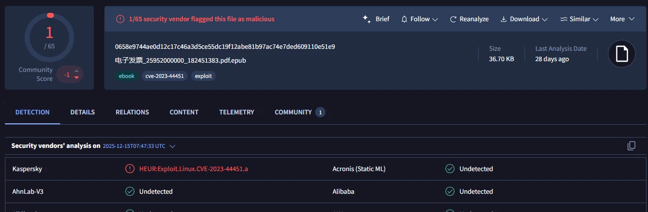 This file was initially detected only by Kaspersky as HEUR:Exploit.Linux.CVE-2023-44451.a. Thanks to this, the file was explicitly tagged with CVE-2023-44451 because it was detected by their engine.