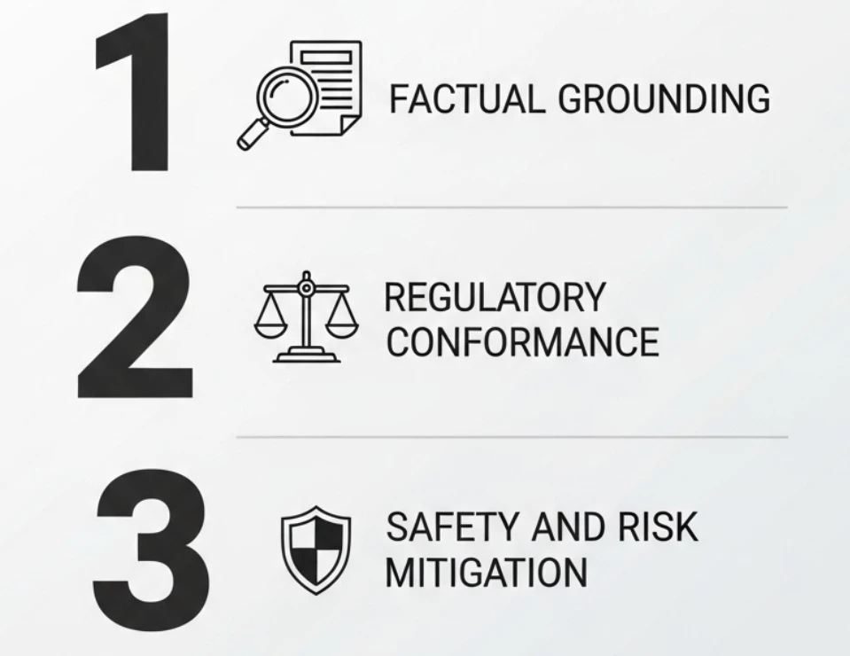 - Factual Grounding: Does the AI-generated summary of a scientific paper perfectly align with the source text, with no factual errors or "hallucinations"? For example, ensuring an AI-generated summary of a clinical trial protocol reproduces the exact endpoints and inclusion/exclusion criteria without hallucination.