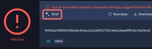 To trigger agentic TI malware triage and analysis capabilities, a user can directly input a prompt in the UI to request the analysis of a sample, or generate a triage report via the Brief button found in the Public and Private Scanning upload pages.