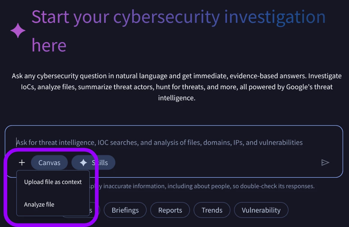 To begin analyzing a threat, analysts can provide a sample to agentic TI in two primary ways: