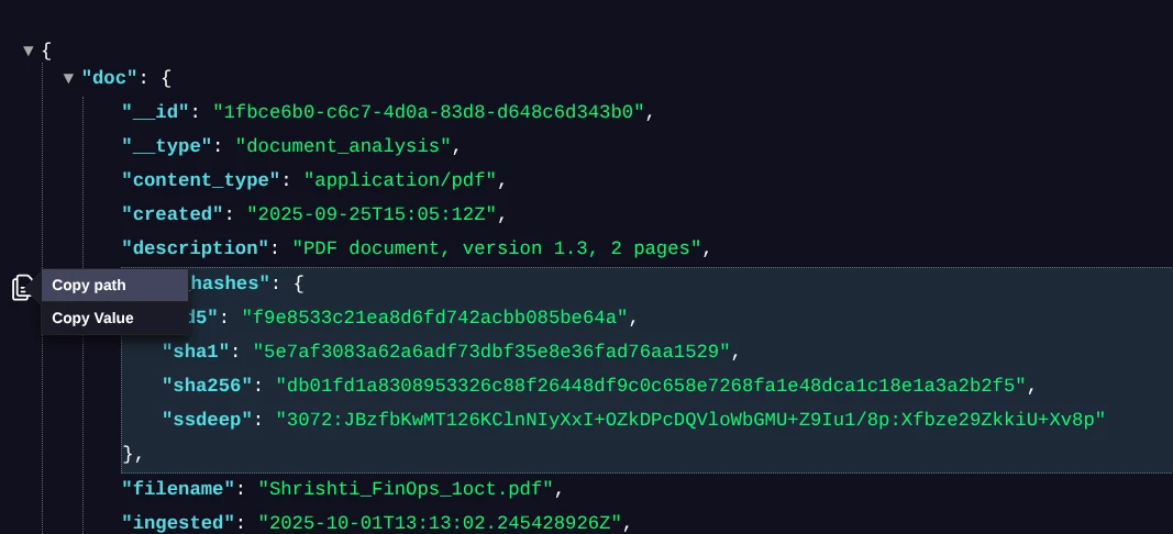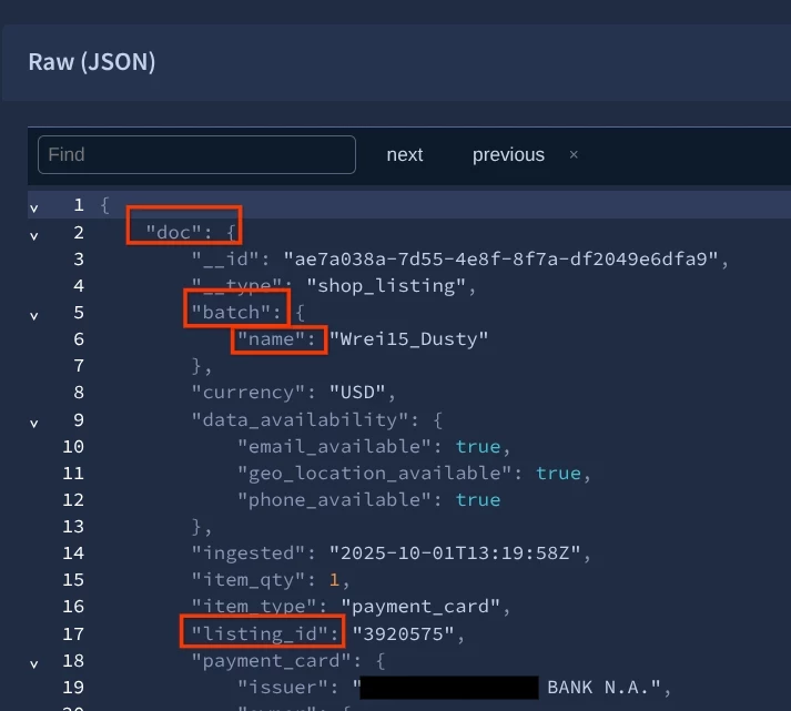 Every time DTM ingests raw data from a source (like a dark web forum post, a paste site, or a shop listing), it converts that unstructured data into a standardized, structured JSON document.