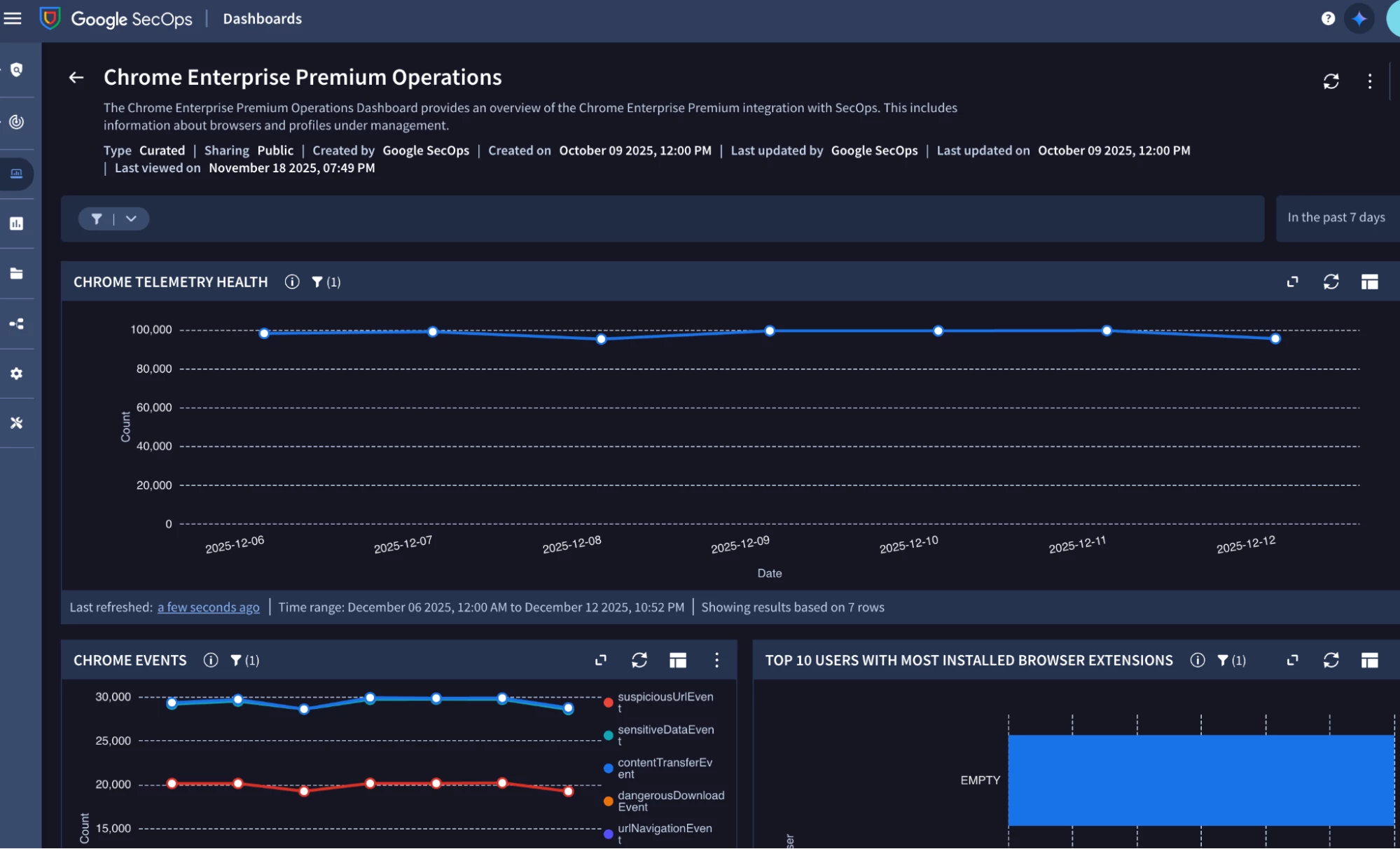 Visibility is the key to effective security operations. We have introduced two curated dashboards focused on Chrome Enterprise Premium data. An operations focused dashboard provides an overview of the Chrome telemetry and enterprise visibility available while the security insights dashboards provides details about threats and sensitive data transfer events detected. These dashboards offer a consolidated view of browser activity, threat landscape, and user-risk posture, enabling SecOps teams to monitor trends, identify high-risk users, and report on the effectiveness of their browser security program.