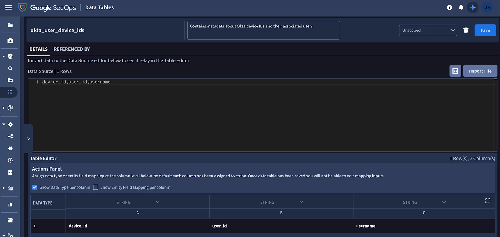 Step one is to create a new data table in Google SecOps that will store the metadata about registered devices and associated user accounts. I name the data table, “okta_user_device_ids” and specify the columns, device_id, user_id, and username. The number of columns can certainly be expanded to include more information, but for today’s example, this is enough to get us where we need to be.