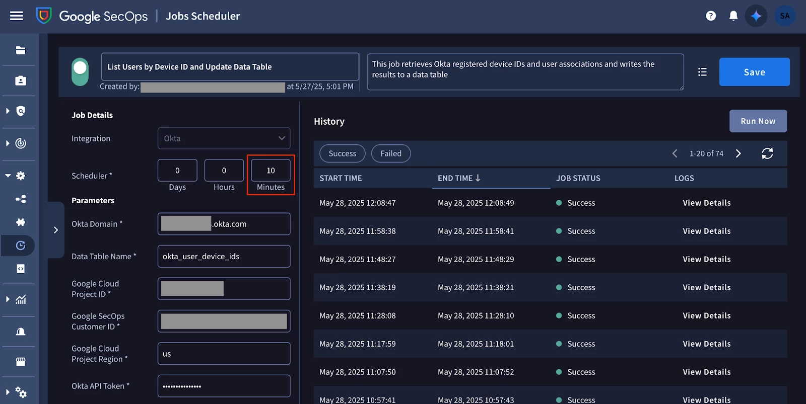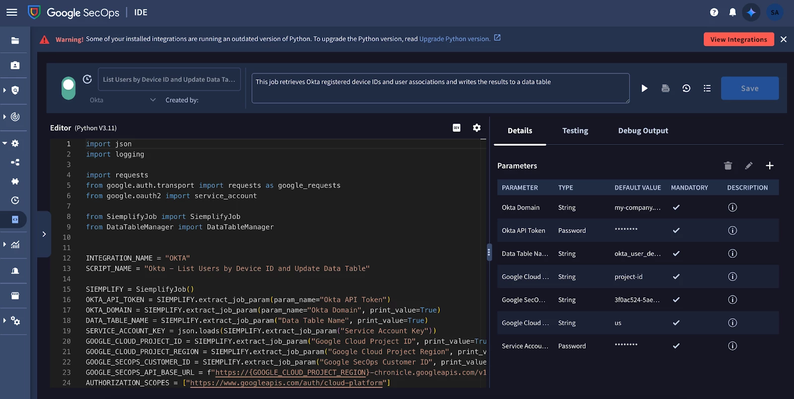 - Create a SOAR job in Google SecOps that retrieves information from Okta’s API on registered devices and associated users and writes relevant metadata to a data table.