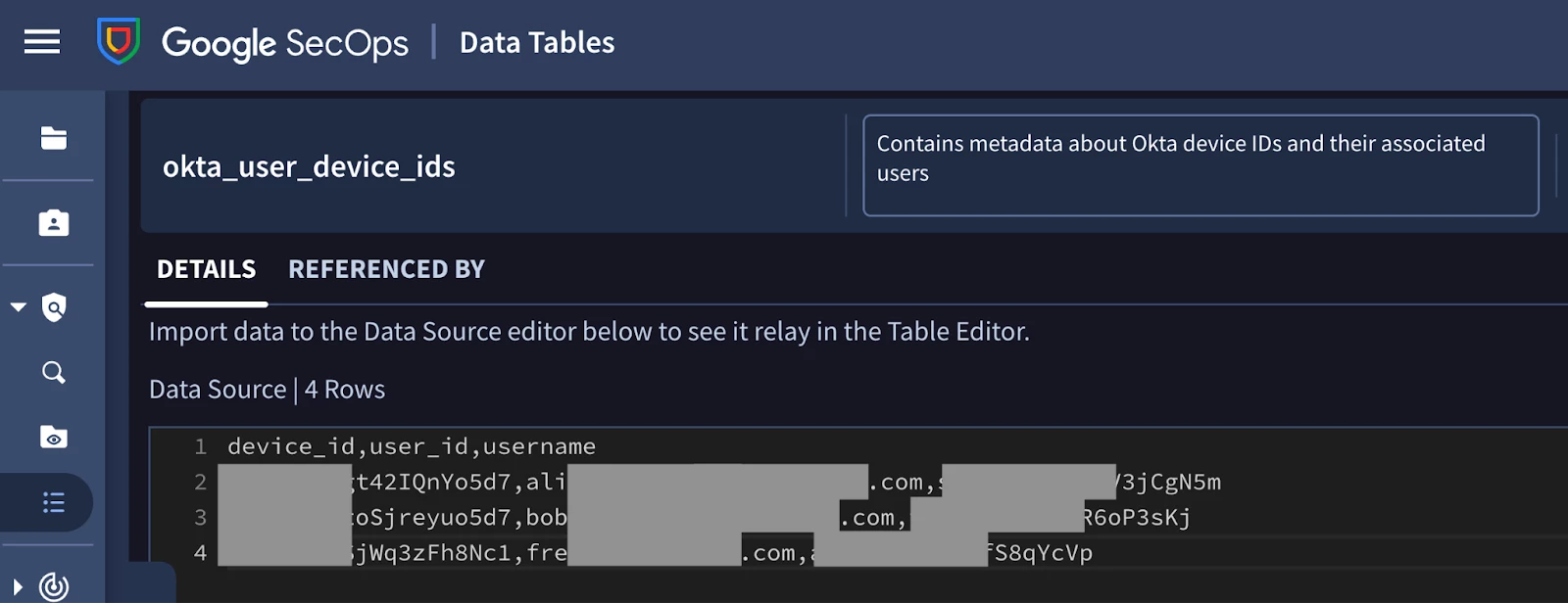 Reviewing the logs for my job reveals that three rows were written to the data table, okta_user_device_ids. Let’s navigate to the data table in Google SecOps and review its contents.