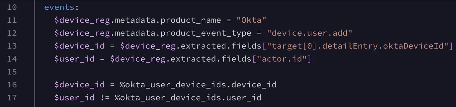 In the events section of the rule, we’re filtering for the presence of the “device.user.add” event type from Okta’s system log. This event is logged when an Okta user registers a new device for MFA, for example, Okta Verify. The unique ID for the device is assigned to the placeholder variable, “$device_id” and the user ID is assigned to the placeholder variable, “$user_id”.