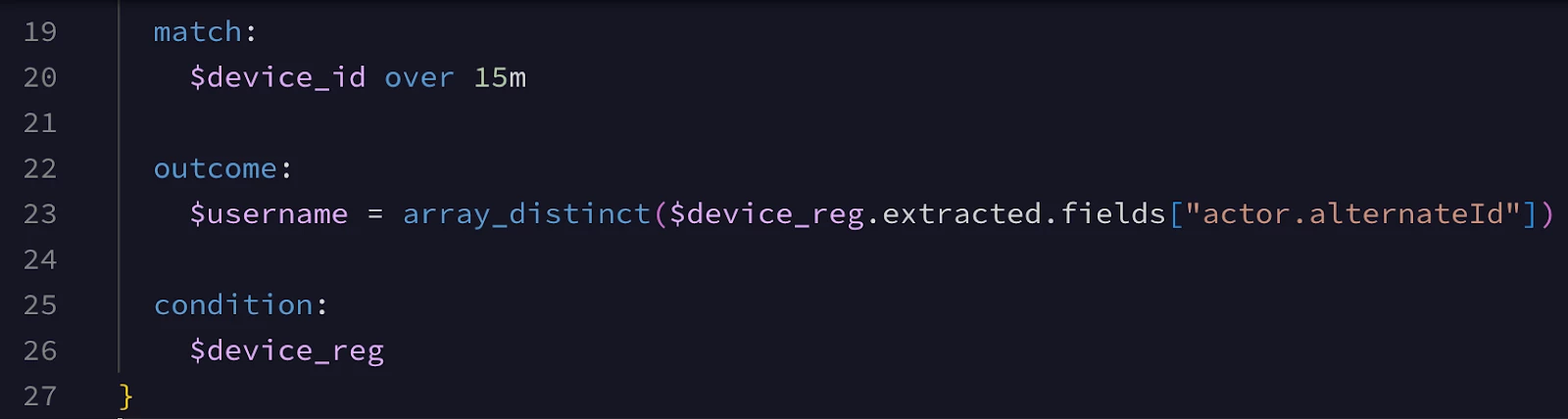 In the match section of the rule, we’re grouping the events by the value stored in $device_id over a 15 minute period. The email address of the user associated with the device is stored in the $username variable in the outcome section. Finally, for the rule to generate detections/alerts, the device registration event ($device_reg) has to have occurred.