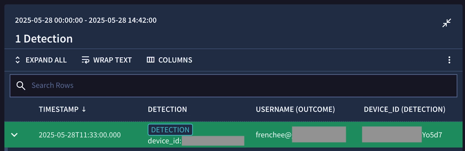 As you can see, my data table contains three rows with values for the device_id, user_id, and username. I don’t have a ton of users in my Okta developer organization, but these are enough objects for us to build the detection that we’re focusing on today.