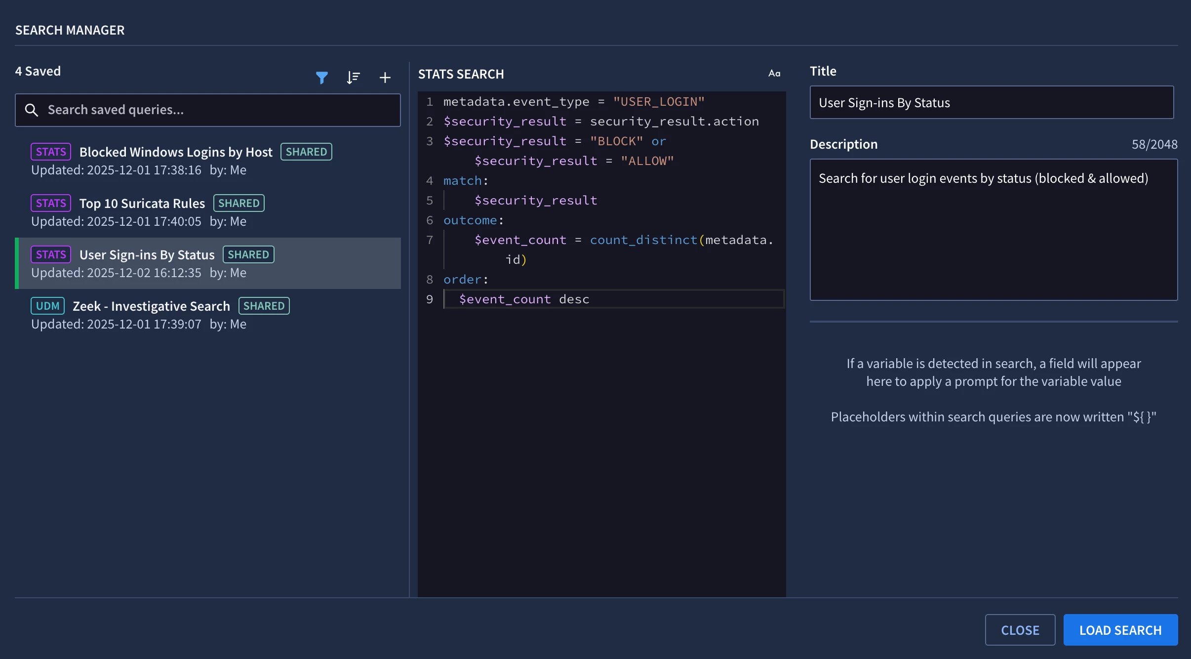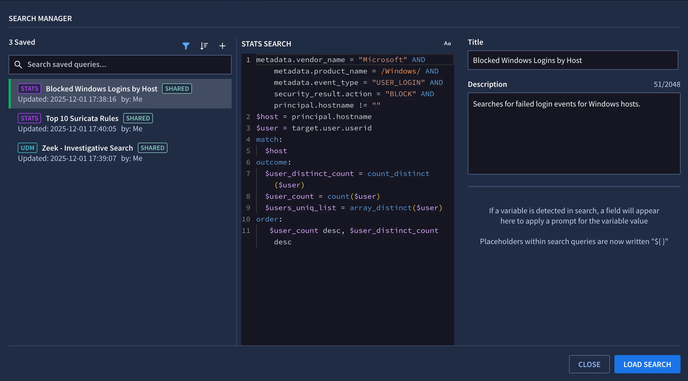 Saved searches are a workflow optimization tool in Google Security Operations (SecOps). They enable security operations teams to store and share multi-line queries, retrieving them instantly without having to recall precise syntax and field mappings. Beyond convenience, they drive consistency during investigations and can serve as your curated library for threat hunting exercises.