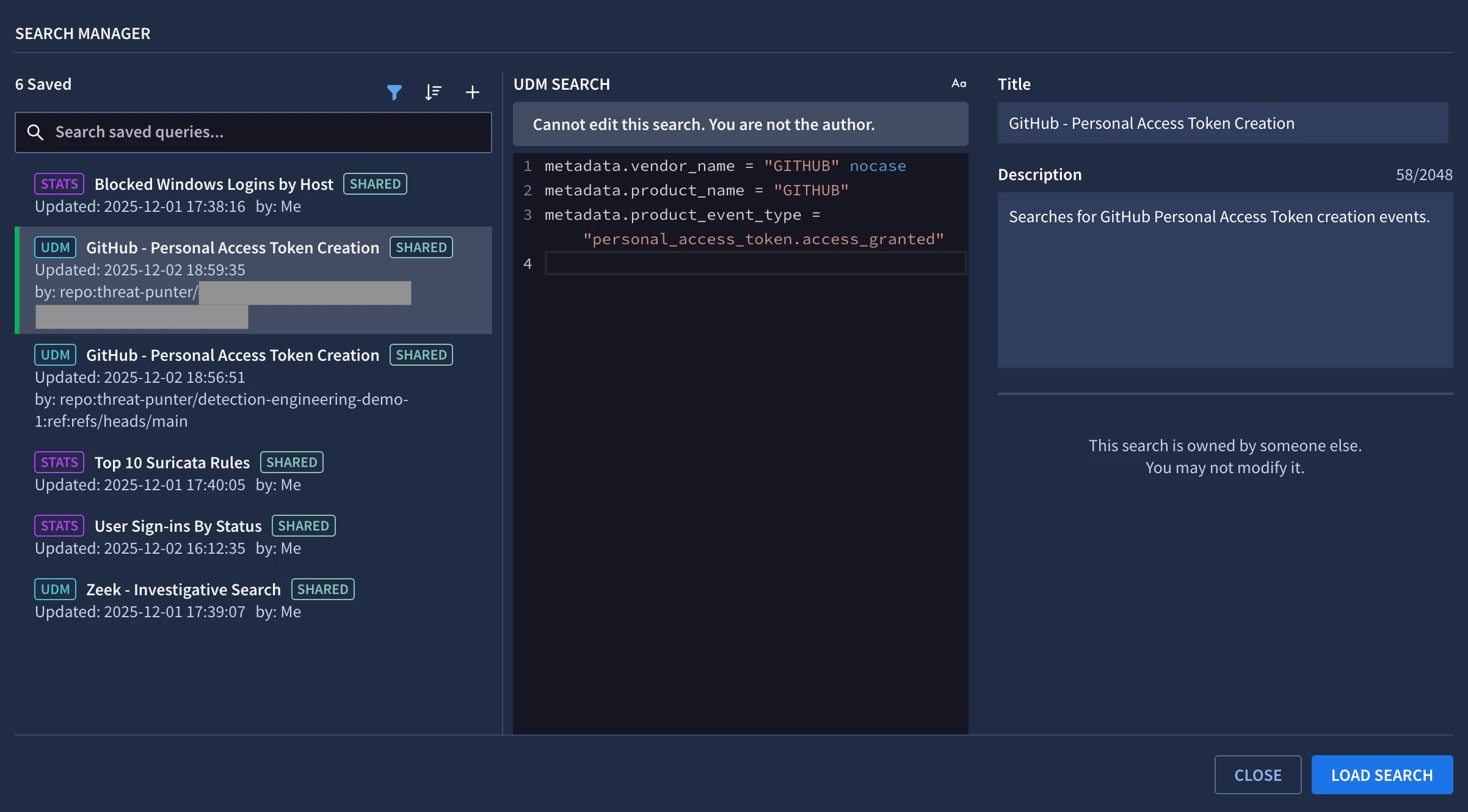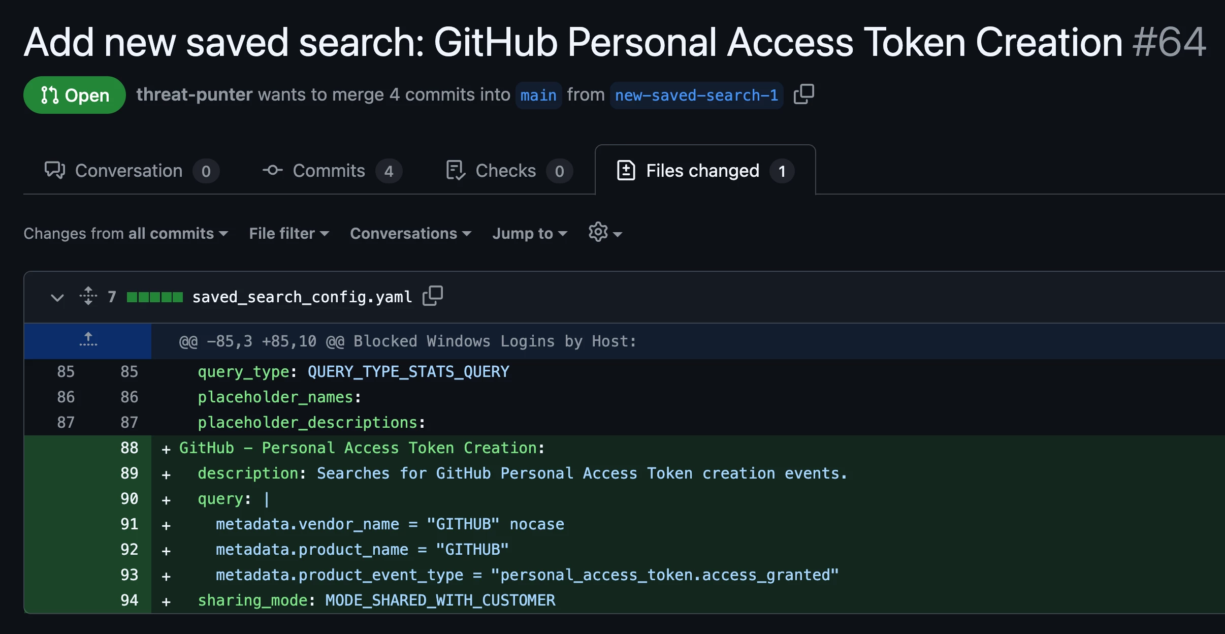 Like many Google SecOps customers, I’ve implemented Detection-as-Code with my own tenant using Content Manager and GitHub Actions workflows. To create a new saved search via my CI/CD pipeline, I create a new branch and pull request in GitHub to stage my proposed changes.