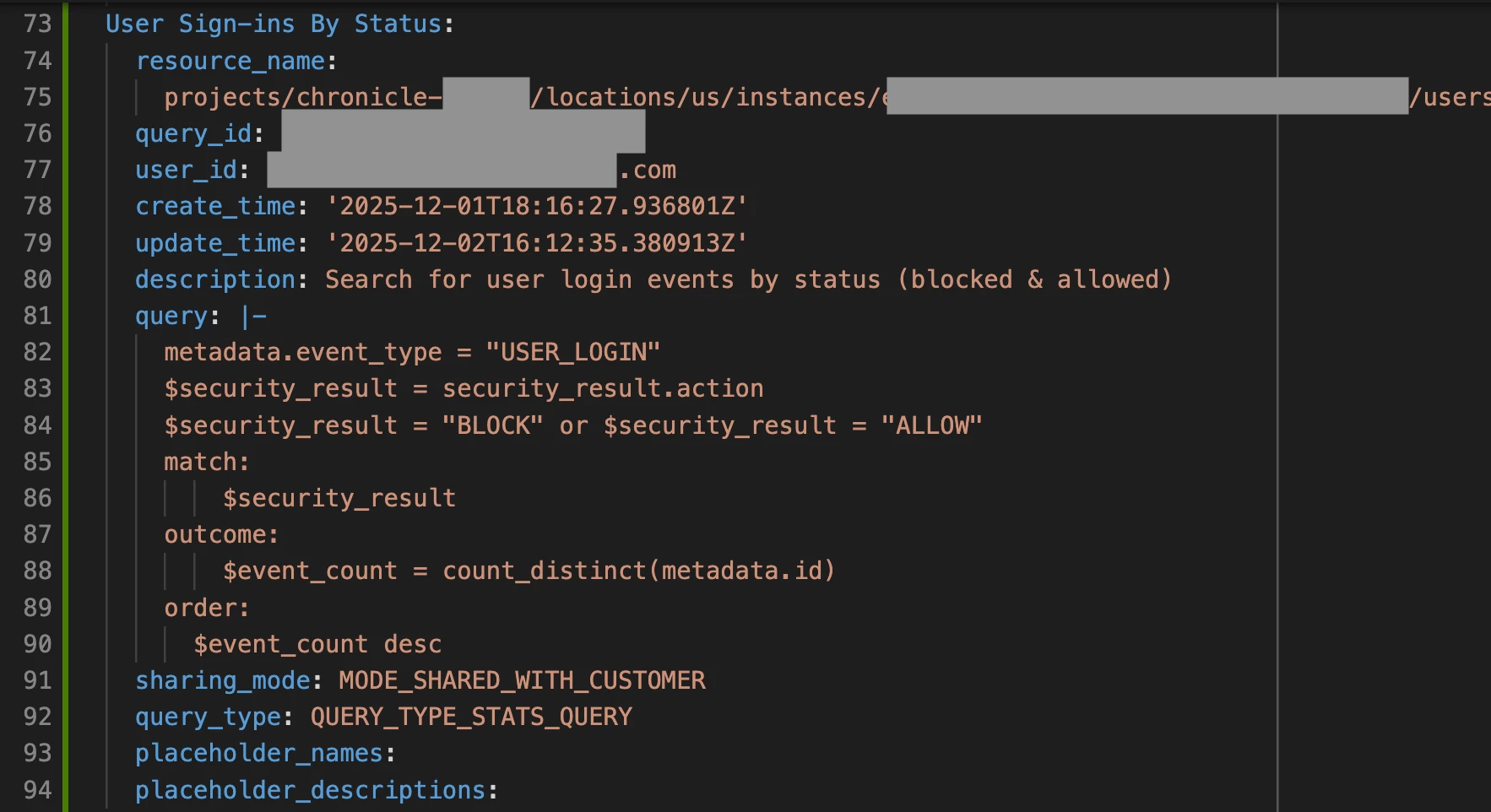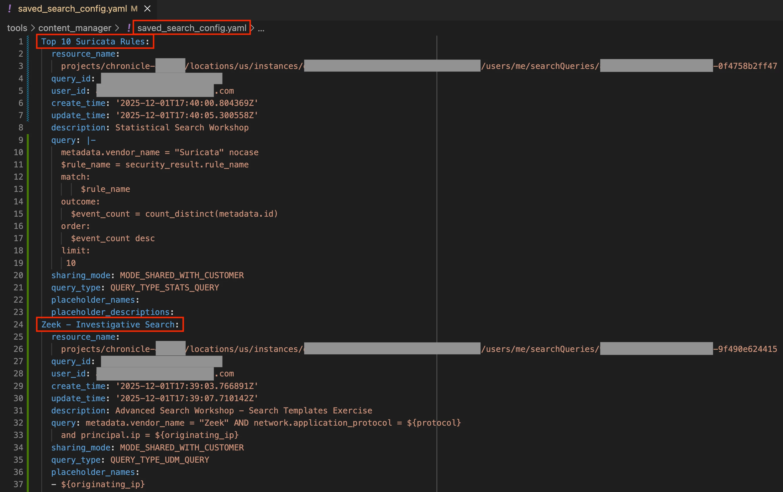 01-Dec-25 11:16:28 MST | INFO | dump_saved_search_config | Writing saved search config to /Users/x/Documents/projects/detection-rules/tools/content_manager/saved_search_config.yamlReviewing the config file, we can see the Google Cloud resource name for the new saved search along with its metadata.