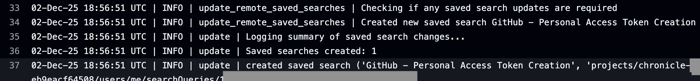 01-Dec-25 11:16:28 MST | INFO | update | created saved search ('User Sign-ins By Status', 'projects/chronicle-xxxxxx/locations/us/instances/{UUIDv4}/users/me/searchQueries/{UUIDv4}')