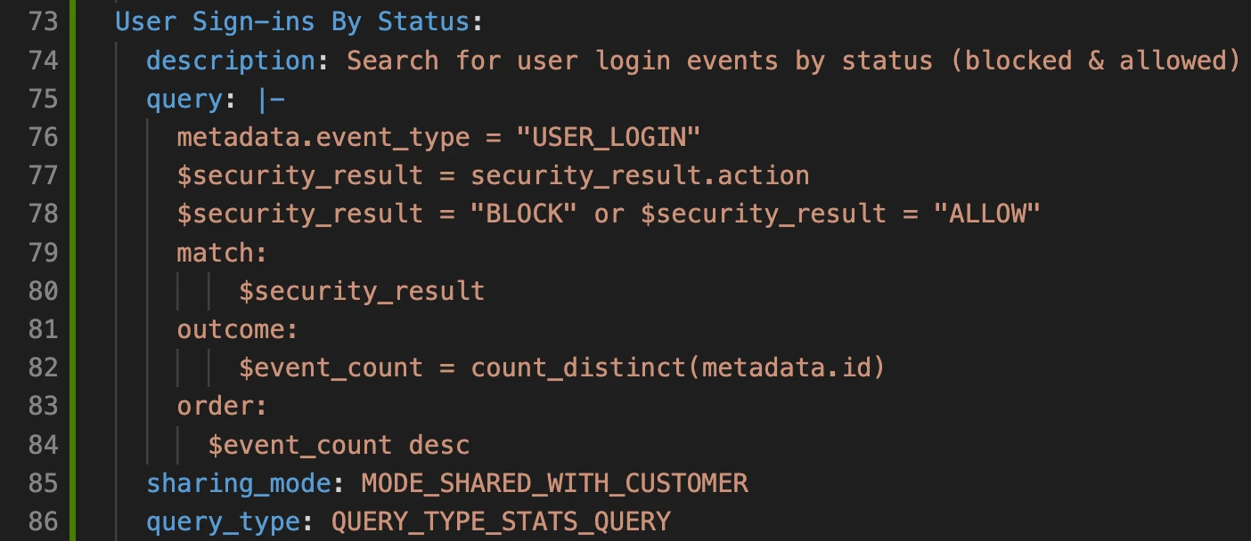 Let’s look at how to create a new saved search in the config file. In this example, I’m adding a new saved search named, “User Sign-ins By Status”. I’ve included a description and query for the saved search and specified that it should be shared with all users in my Google SecOps tenant. The supported values for the “query_type” field are listed in our documentation.