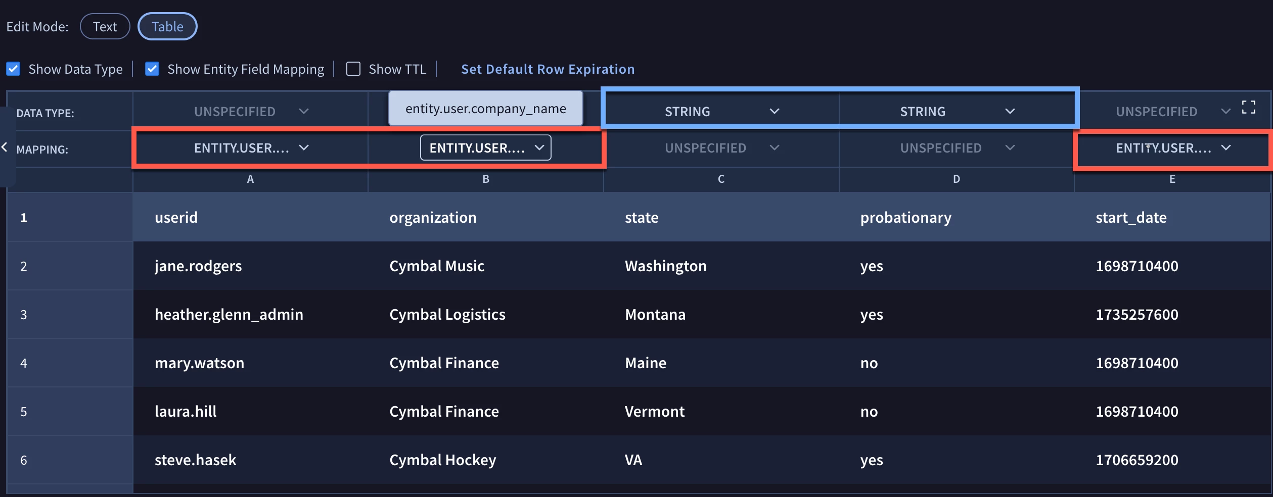 For our first example, we have mapped the userid column to the entity.user.userid field, organization to entity.user.company_name and start_date to the entity.user.hire_date.seconds. Two additional columns named state and probationary are mapped to string fields.