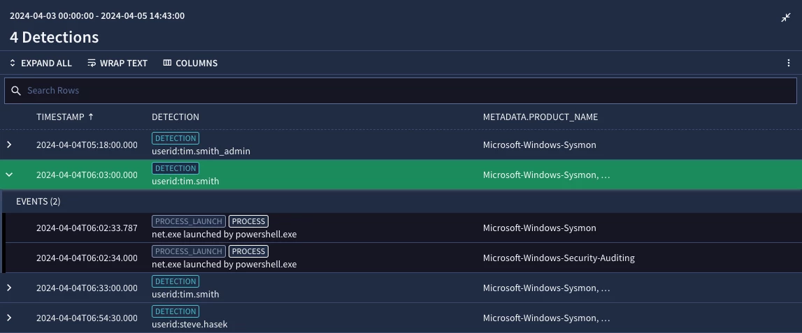 The Detections screen indicates this rule is detecting the activity for both Sysmon and Windows event data. So far, so good.