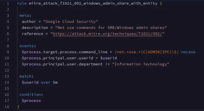 Yes, it does depend. If you recall, Google SecOps automatically enriches UDM events with entity values for users and assets. Fields that contain entity information like department, company, title, and address are automatically enriched in UDM if you are ingesting contextual data like Workspace, Active Directory and the like. Therefore, we don’t need to join the events and entities together to update our rule to filter out the IT department; we can use the fields that exist in the UDM events. Below, we’ve added criteria (line 11) that uses enriched entity data in the event to refine the rule. Nothing else changes in the match or condition sections of the rule.