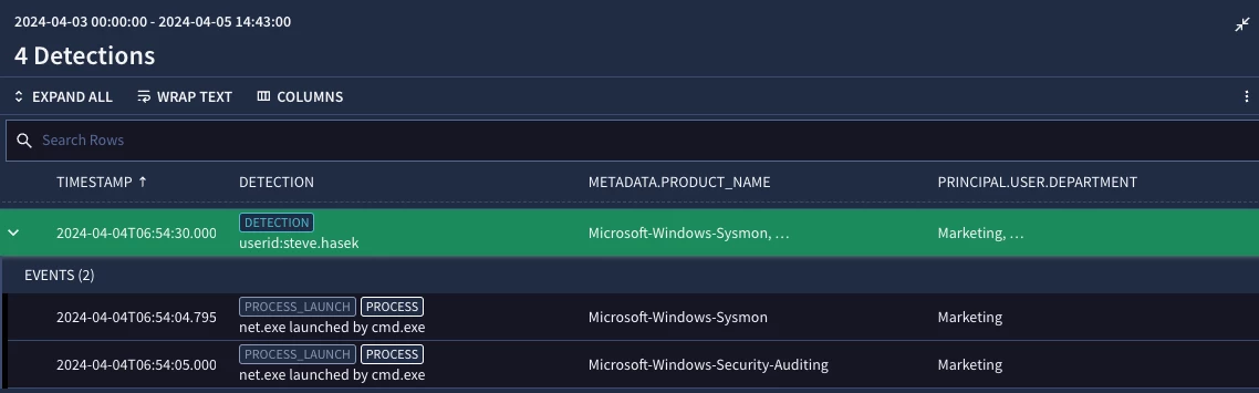 }In the results, the principal.user.department column is added, and we can see that a user from the Marketing department has been detected using the net.exe command to create the admin shares.