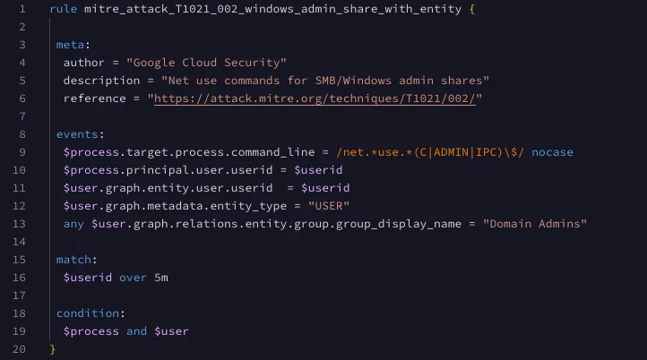 We can easily convert this search to a YARA-L rule. Here is what that search looks like converted to a rule.