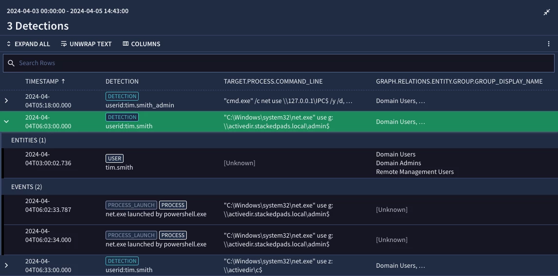 Today, let’s move forward and show how to apply this capability to our YARA-L rules. To ensure everyone is on the same page, we will start with the search we used at the end of the contextual awareness post. We are looking for process command lines that execute the net use command that then attempt to map to C$, ADMIN$ or IPC$.