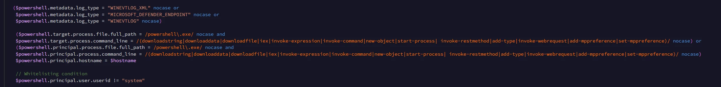 Last but not least, because this rule is referencing both event variables, $process and $user, we need to ensure they are both found in the condition section of the rule. I used this naming convention to clearly define the event and the entity in my detection. Creative, I know, but descriptive.
