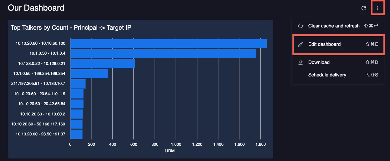 The dashboard tile we are going to build today is going to provide us visibility into the severity of the detections that have been triggered over the past seven days. We are going to build from the dashboard that we created last time. Before we can add more tiles to it, we must get into edit mode, so click the three buttons in the top corner of the dashboard and select Edit dashboard.
