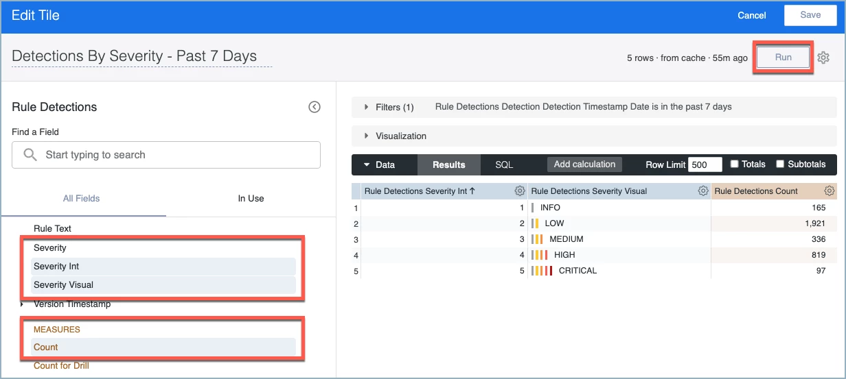 With our date range established, let’s select some fields to populate our tile. Notice in our field list, there are three different severity fields. Severity is a text value of Info, Low, Medium, High and Critical. Severity Visual is the same but with those little colored matchsticks next to each value. Security Int is the integer value for each severity value.