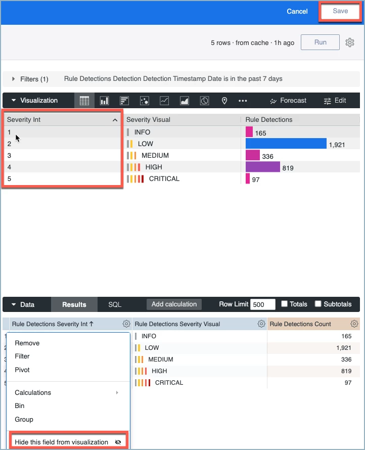 Now let’s turn toward our visualization. For this tile, we are going to stick with the default tabular view, but we really don’t want that integer value taking up space. With our sort in place, let’s click on the cog next to the Security Int field in the data section. In the drop-down menu, select the Hide this field from visualization option. This will remove this column from our tabular value. We could run our criteria again if we needed to test further, but we can click Save at this point and we will see our tile in our dashboard. After taking the time to build a tile, I always recommend saving your dashboard, even if you plan to build more tiles or modify your dashboard further.