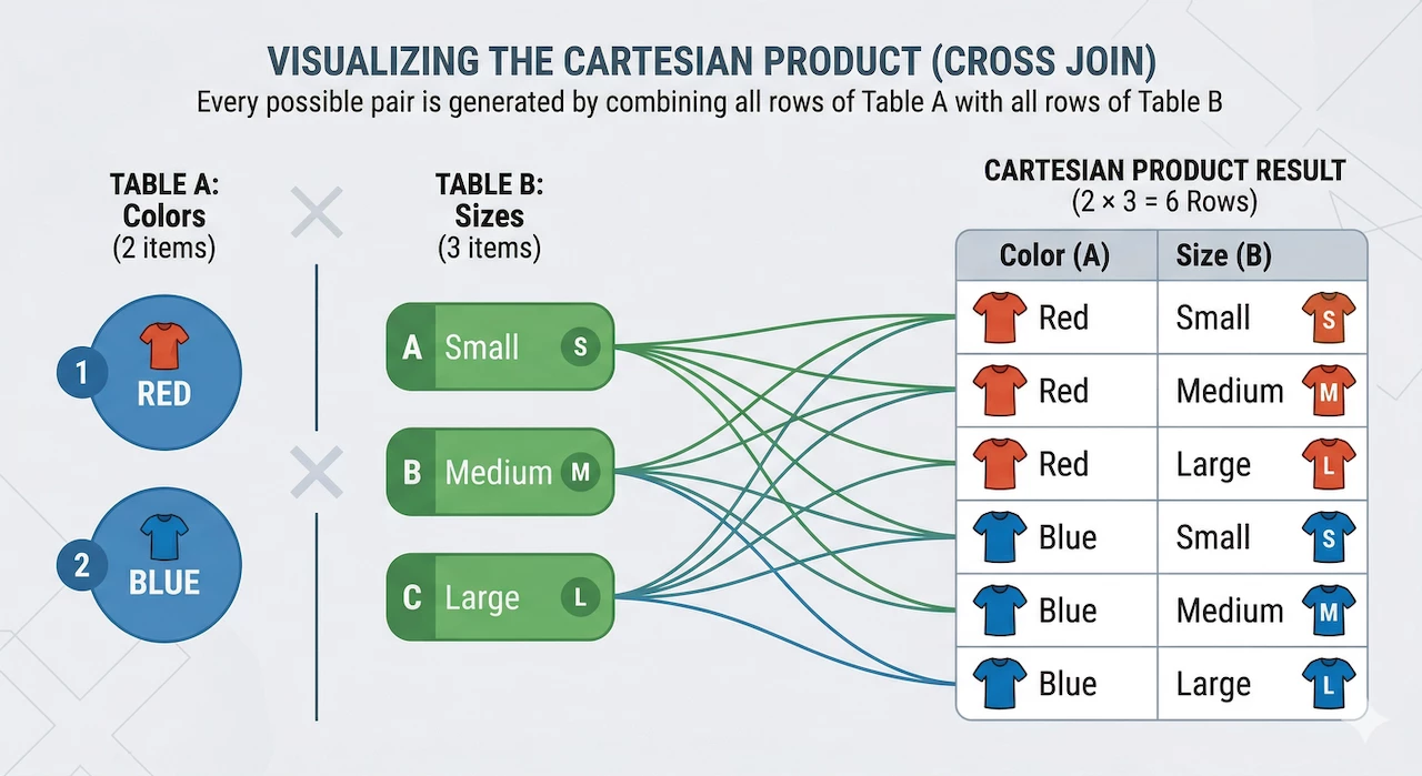 A cross join, unlike an inner join or outer join (right/left join), does not require a join condition between two tables or datasets, so the result of a cross join is a Cartesian Product and can result in a combinatorial explosion of results. What do I mean by that?