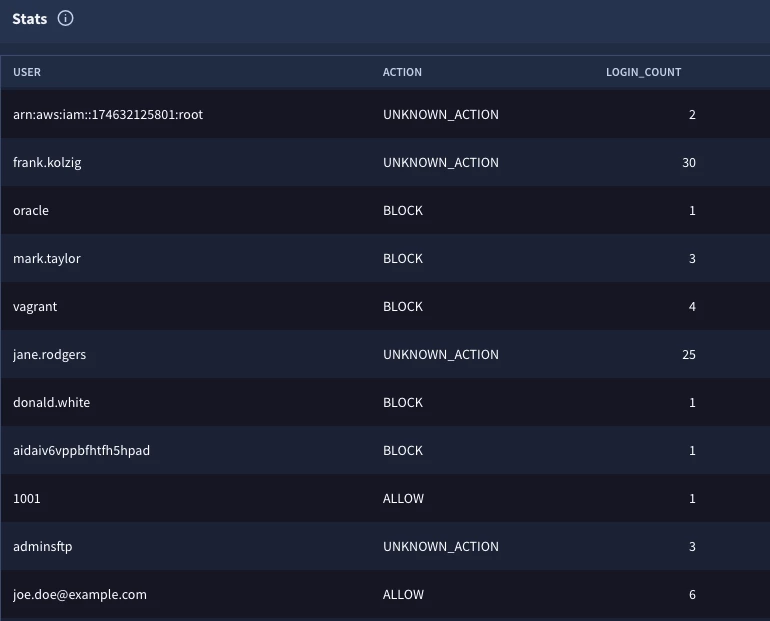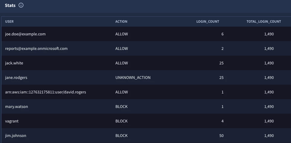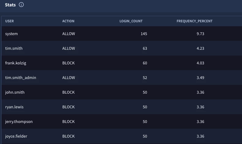Let’s say we wanted to determine the login frequency for user authentications and determine which users have a greater frequency than others. Obviously, comparing service accounts to users is not going to be an apples to apples comparison, but this example highlights how we can use multi-stage search with the cross join to compare users or assets or anything else against a population. While events can have multiple security results associated with them, in an effort to not get bogged down in repeated fields, we are going to just focus on the first security result in each event.