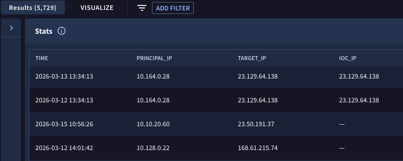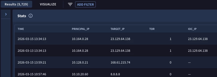 left join $net.target.ip = $ioc.graph.entity.ipTo highlight the differences in these joins, we are going to start with an inner join and then swap the inner join for a left join. Let’s start by building a search for network connection events that have a target IP address that Google has identified as a TOR Exit Node.