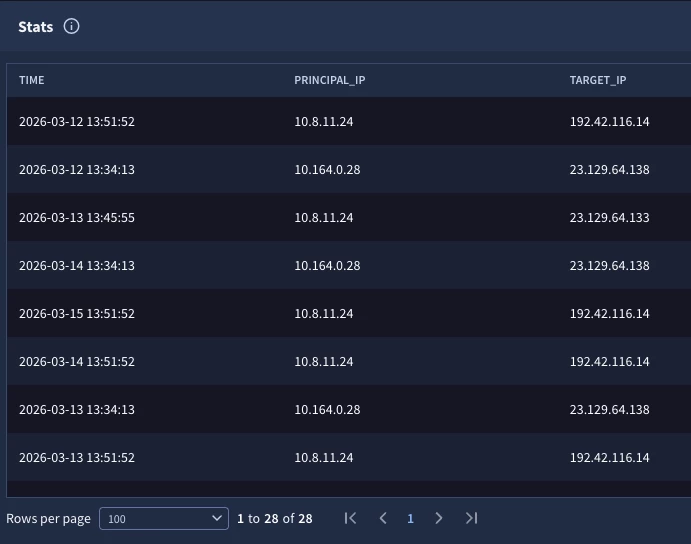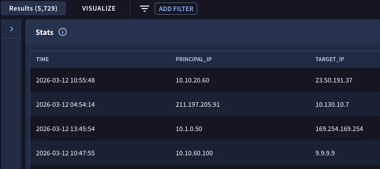 Notice the results at the top of the image. We are returning all of the network connection events whether or not they are communicating with a TOR exit node or not. However, because I didn’t specify any additional values to output beyond the three variables in the match section; time, principal and target IP address, I don’t have any context around which of these rows are in the TOR list and which aren’t. This is a common pitfall when working with outer joins. Make sure you add context to these outer joins to really help you get value from them!