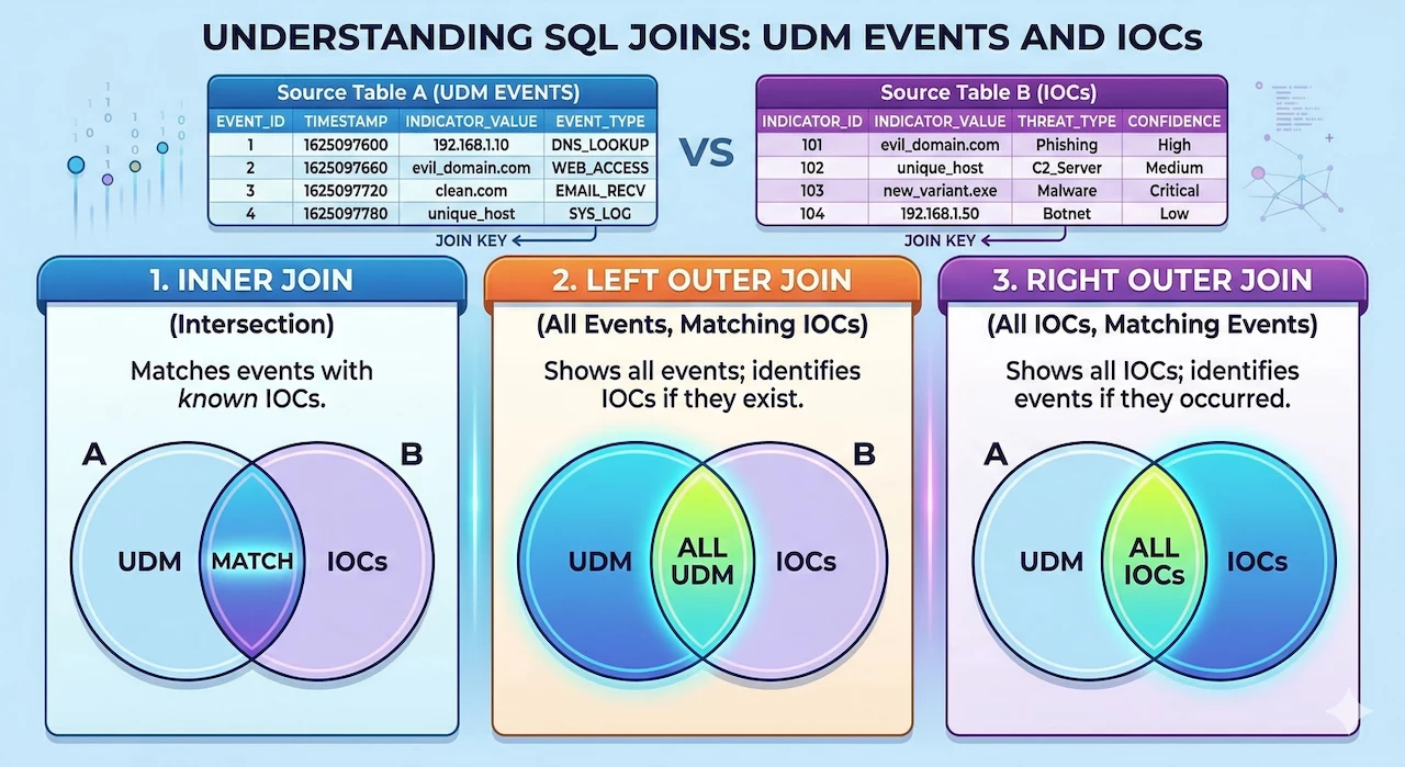 Our examples today will focus on using a left outer join to join UDM events to IOCs in the entity graph. The syntax for constructing a left (or right) join is just like what we have been doing for inner joins but instead of using the term inner, we substitute left or right: