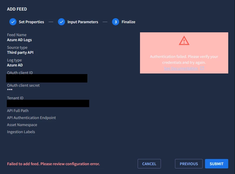If you see a failed status next to a specific feed, you can hover over it to get some additional information. If you get a HTTP 403 error like this, adequate permissions for the specific feed may not be set properly. In this example, our Entra ID application had Office 365 permissions but not the correct Graph API permissions for the Azure AD log type.