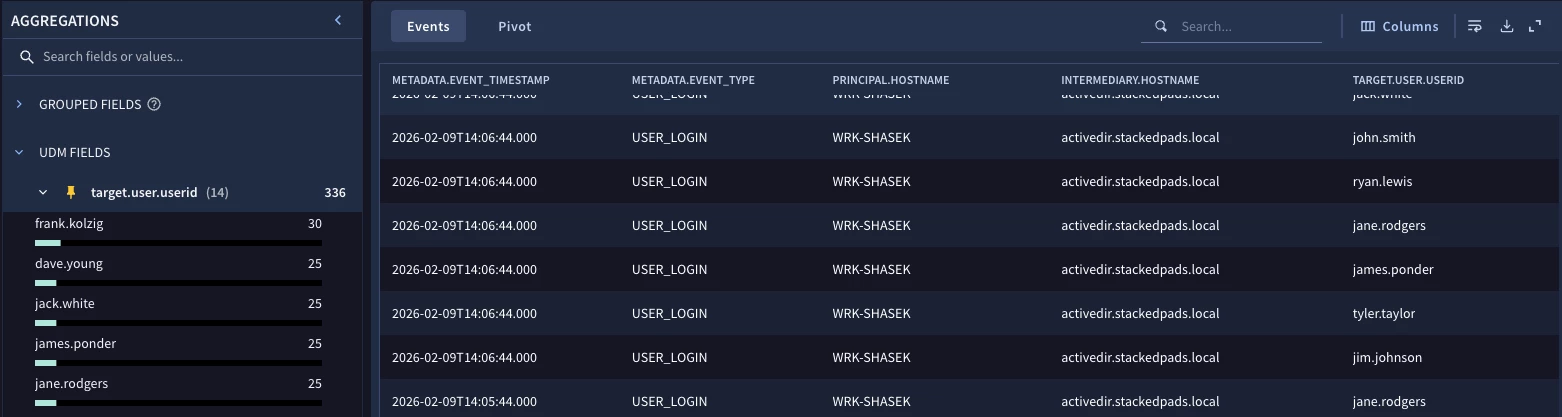 Here we can see that during the search window, we have 336 failed login events. The field target.user.userid displays the users who were attempting to login to the system in the intermediary.hostname field and the principal.hostname is the system the login attempt originated from.