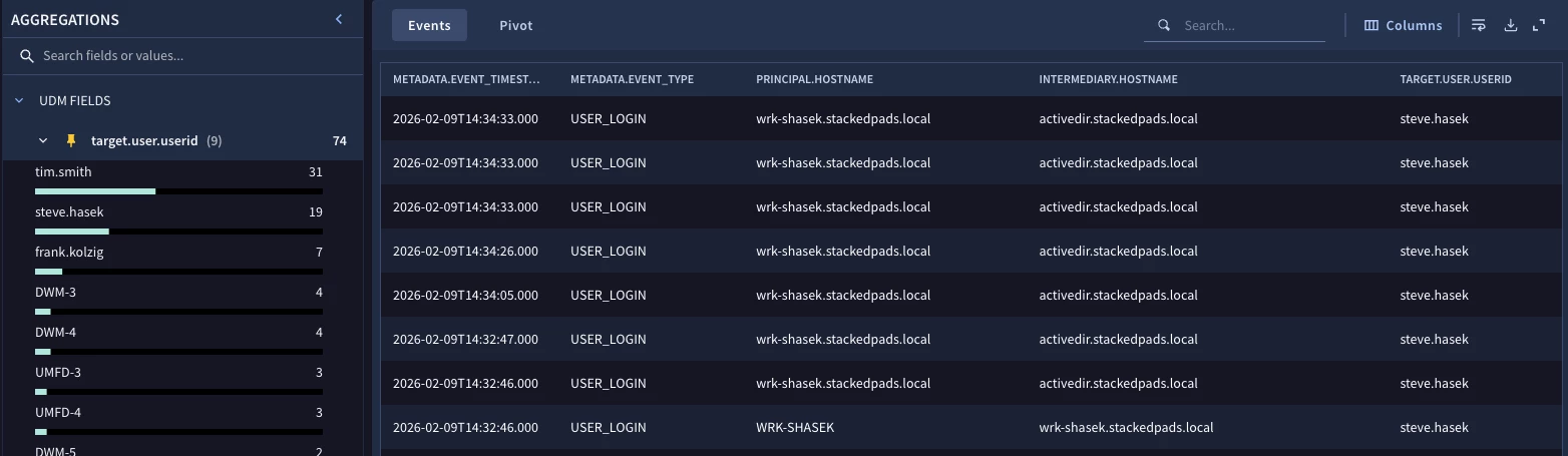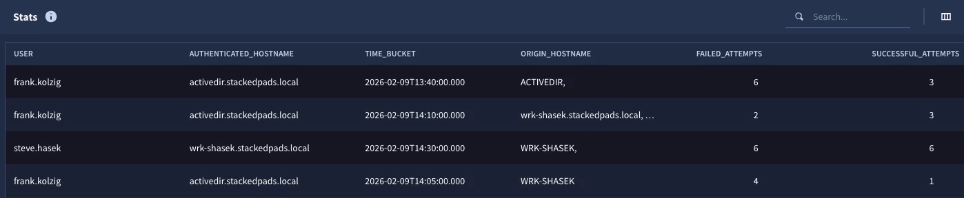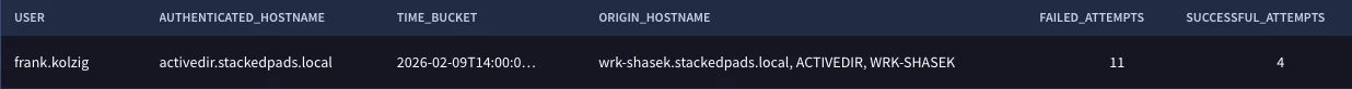 With the changes we made, we can see that the user frank.kolzig authenticated to the activedir.stackedpads.local host from different hosts and succeeded four times and failed eleven times during the time window of February 9, 2026 between 14:00 and 15:00. Based on that information, we could easily pivot back and investigate Frank’s activity during that window.