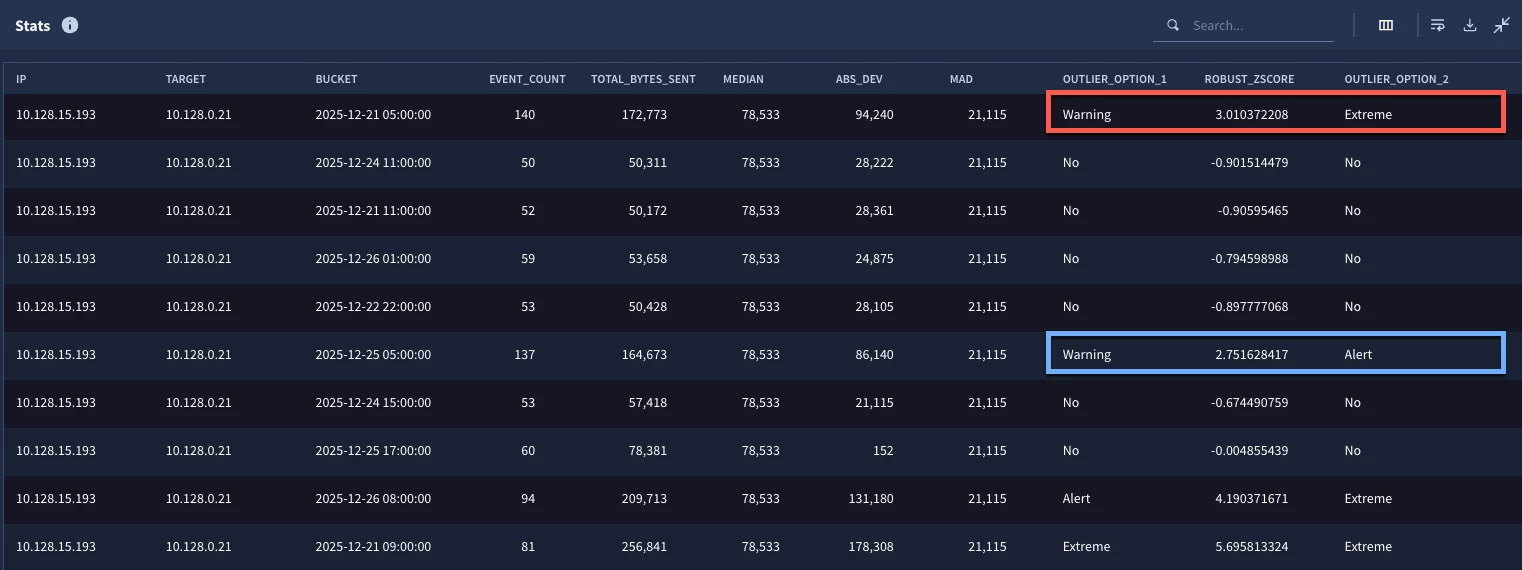 In the outcome variable above, we are using conditional logic to output a value based on comparison of the total_bytes_sent and that calculated threshold. These multipliers align very roughly to standard deviations but they aren’t exact as MAD is smaller than the standard deviation. I’ve gone back and forth as I wrote this to determine if I should include the math and how this is arrived at and I landed on providing a link instead.