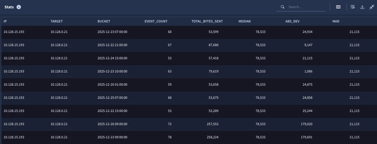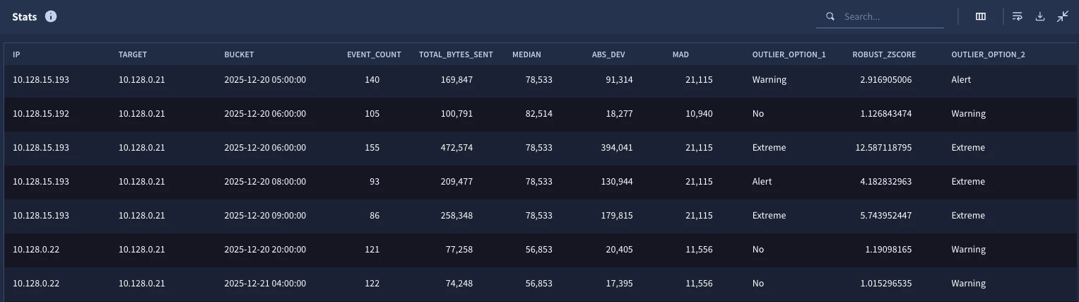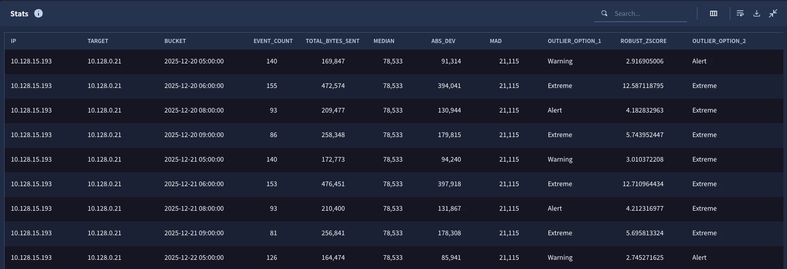 Now when we run it, we can see outliers from other pairs as well. One important point that I want to highlight here is that the median and the MAD for each IP pair is unique. Remember the match section in the stages made the median and MAD specific to the IP pair, not the entire population for the entire search window.