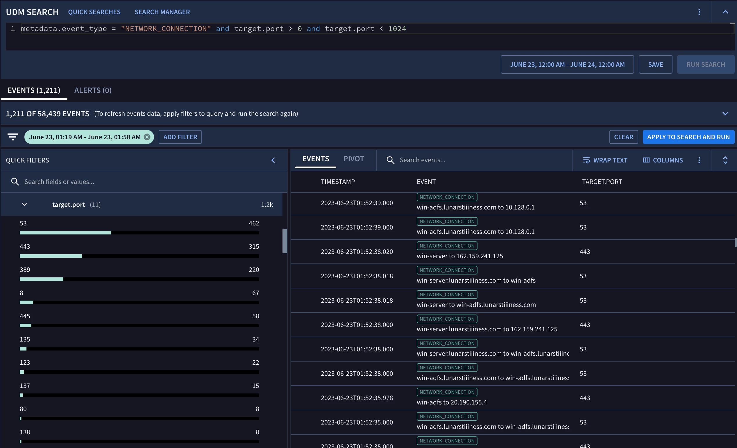 I understand the pain that this one causes but there is a straightforward method to address this. Let’s start with the port fields. The UDM field list defines port fields as integer fields. This means that when they are used in search or rules, they are defined as the value itself whereas string fields will be enclosed in quotes. Here is a search to illustrate the different syntax used.