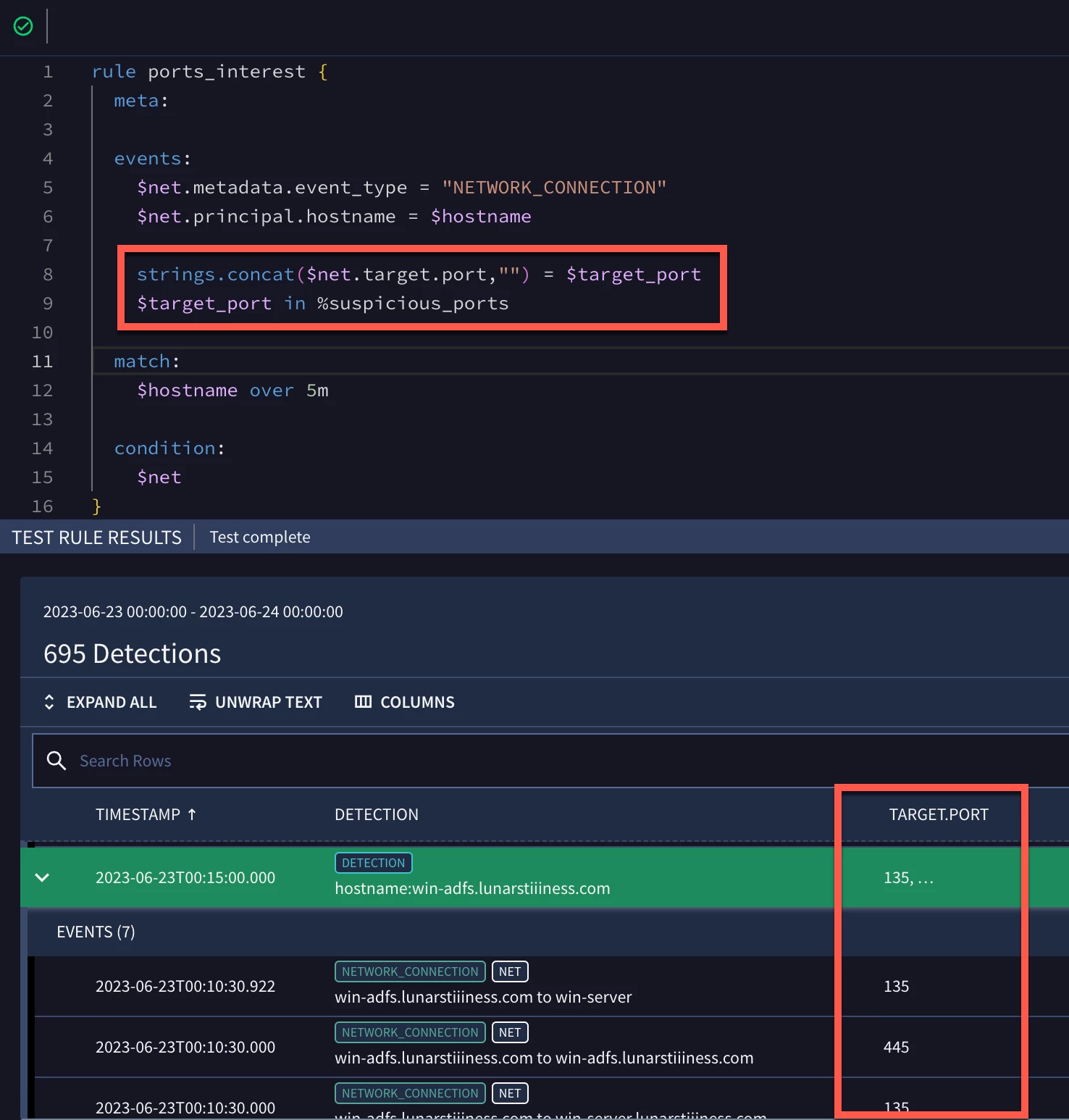 In our test rule results, we can see that ports including 135 and 445 are returned which align to the listing of ports in our list.