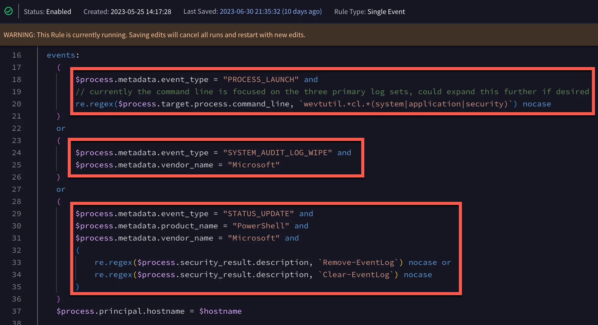 Digging a little deeper into our third method, we can see that we have three distinct values we are looking for in specific fields and then we have two additional regular expression strings and we are expecting one or the other to meet this specific set of conditions. Notice that we have a parenthesis around those two pieces of criteria (lines 33-34) nested within the larger criteria and how we are using and/or throughout our criteria. Finally, notice that line 37 is outside of all the parenthesis and applies to any of the three methods listed above it. Because we are outside of the parentheses, we are back in a place where the and operator is assumed.