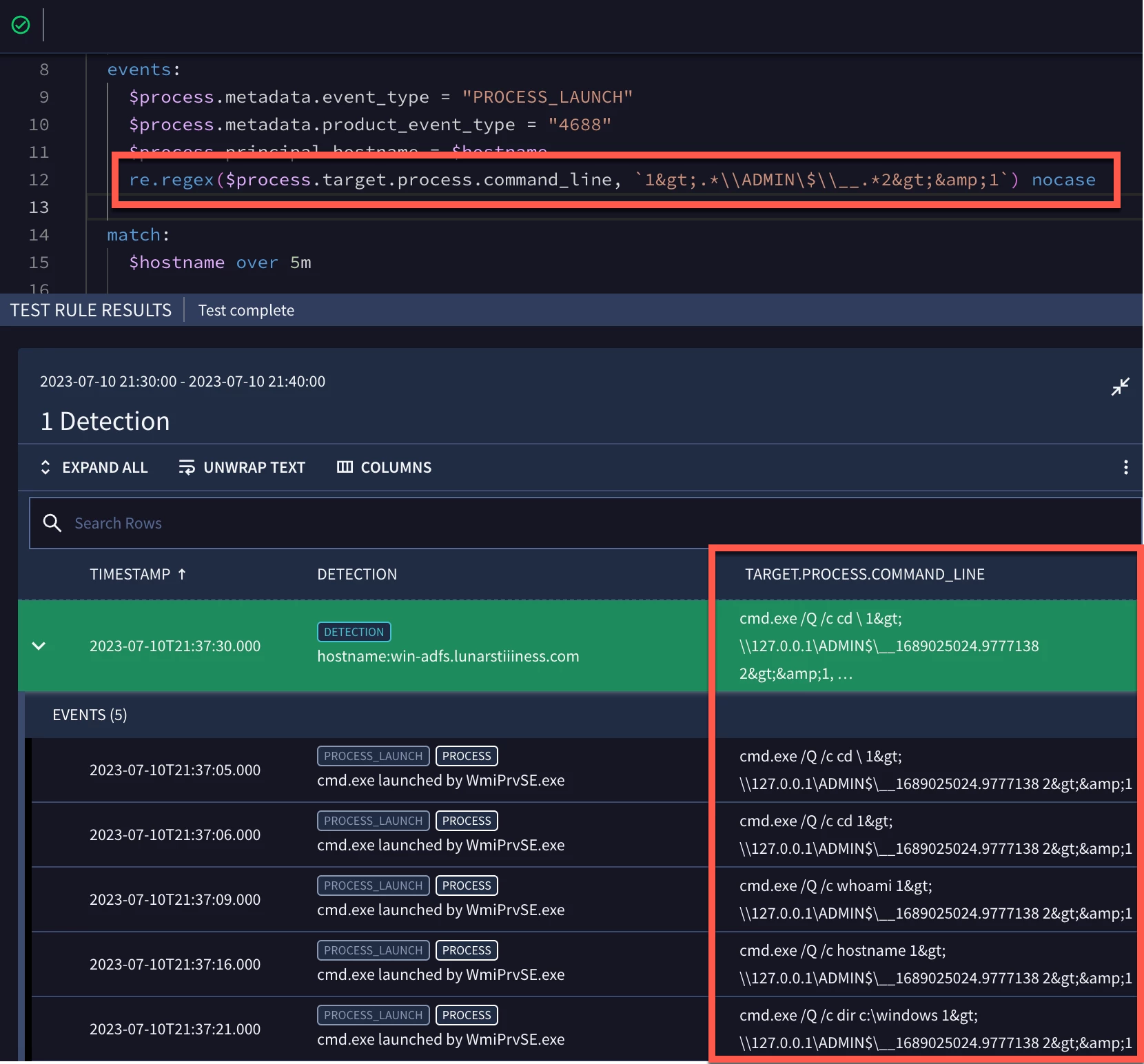Of course, there are variations but this serves as a good place to start when building our detection for wmiexec.py. Here are the results of our test rule.