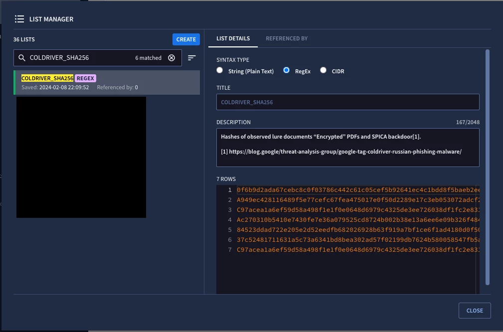 The screenshot below shows the new Reference List in the Chronicle web UI. Note that I’m searching for the name that I provided in the above command, COLDRIVER_SHA256.