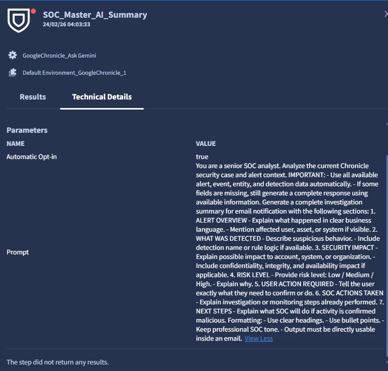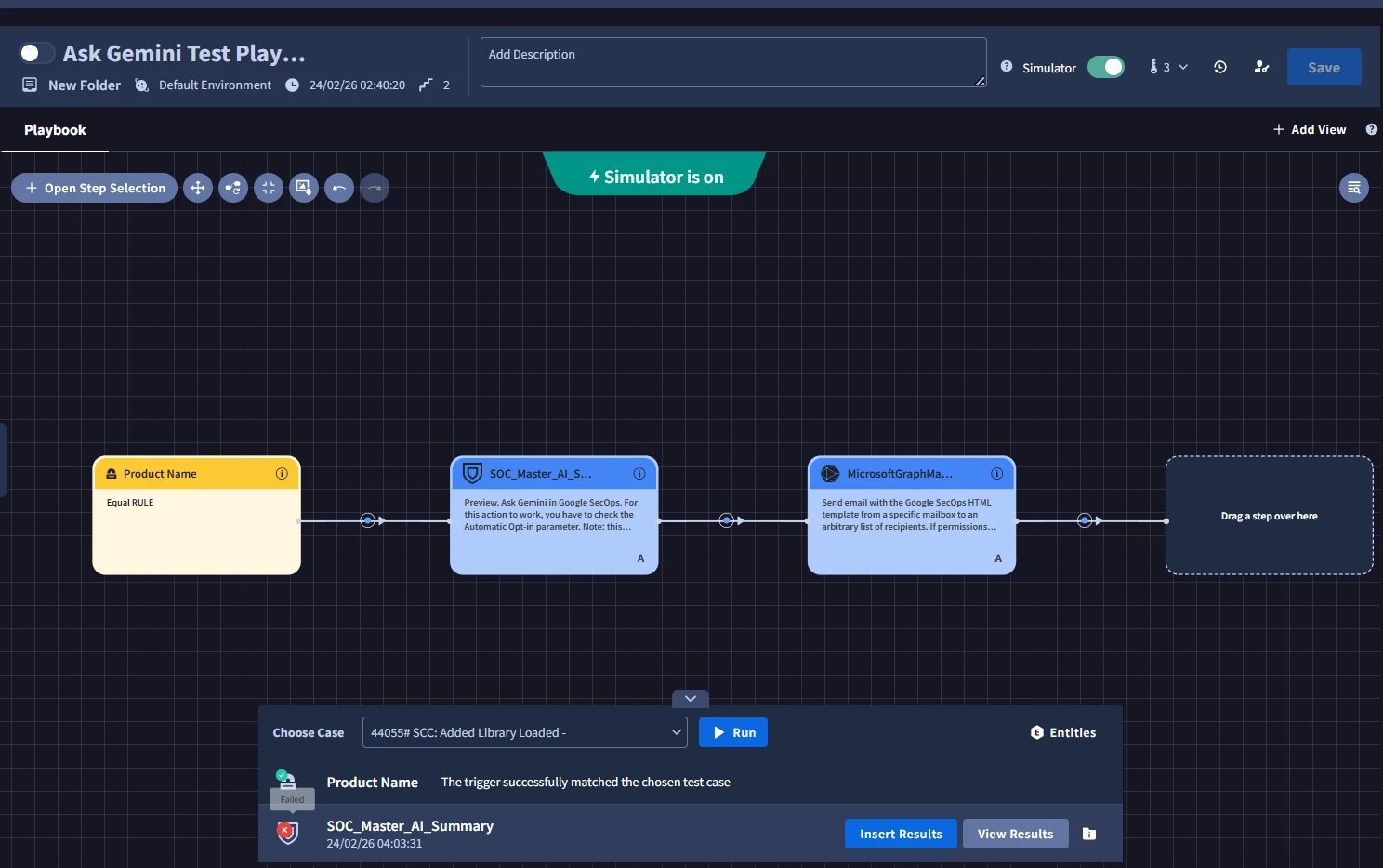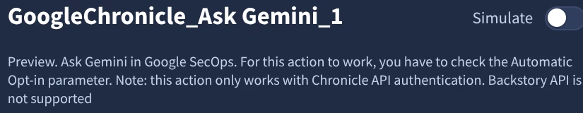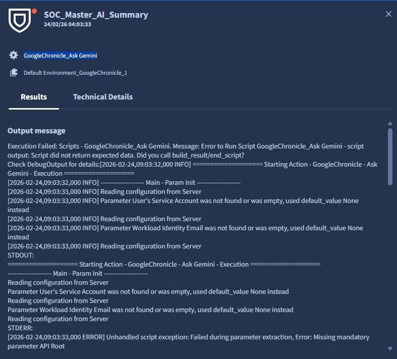 We are currently working on improvising the "Gemini Summary" to make it more informative & add more context for our SOC team & the end users. We got to know this can be accomplished with the help of a playbook incorporating the "Ask Gemini" action. We have designed the playbook along with a prompt. When I simulate the playbook, I get an error message "Execution Failed: Scripts - GoogleChronicle_Ask Gemini. Message: Error to Run Script GoogleChronicle_Ask Gemini - script output: Script did not return expected data. Did you call build_result/end_script?". Attached is the detail error screenshot.