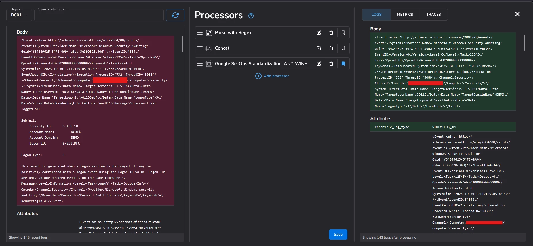 I have setup a Windows log collection via the Bindplane agent, everything is working fine. I just have one small issue with the logs : rawlog format is XML, it contains a key "RenderingInfo", that is useless and very verbose & that I would like to ditch at the agent level. A sample raw log is attached at the end of the post for reference. I am not sure what processor to use to remove this part of the raw log.