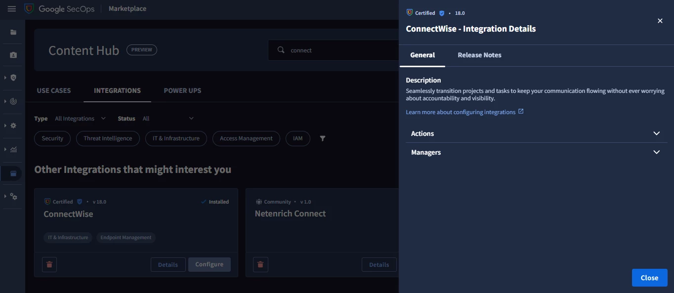 But in the marketplace, within the ConnectWise Integration, we only have Actions and managers not the jobs. We dont have jobs to sync between Google SecOps cases and ConnectWise tickets.
