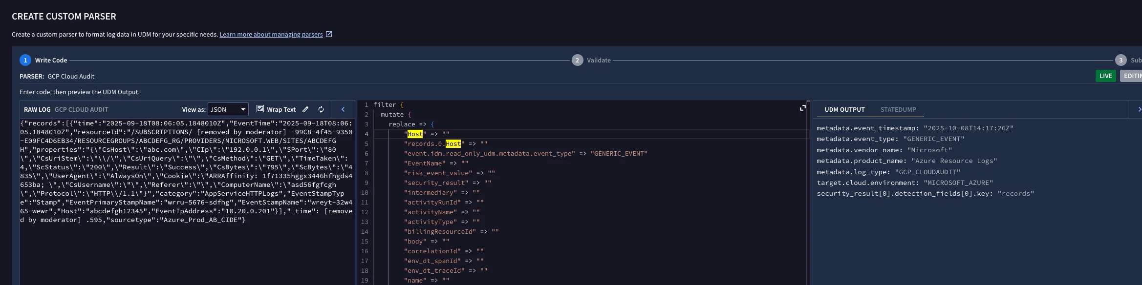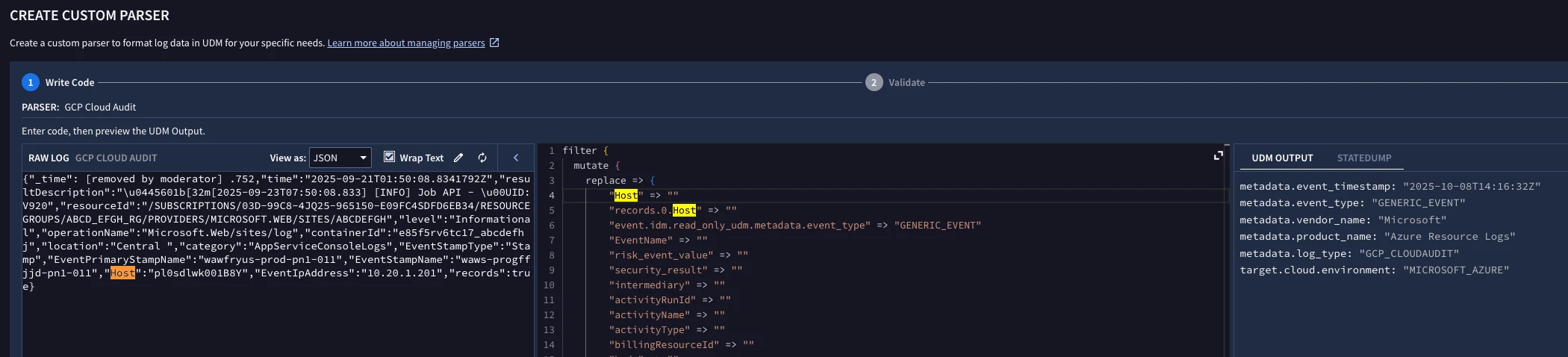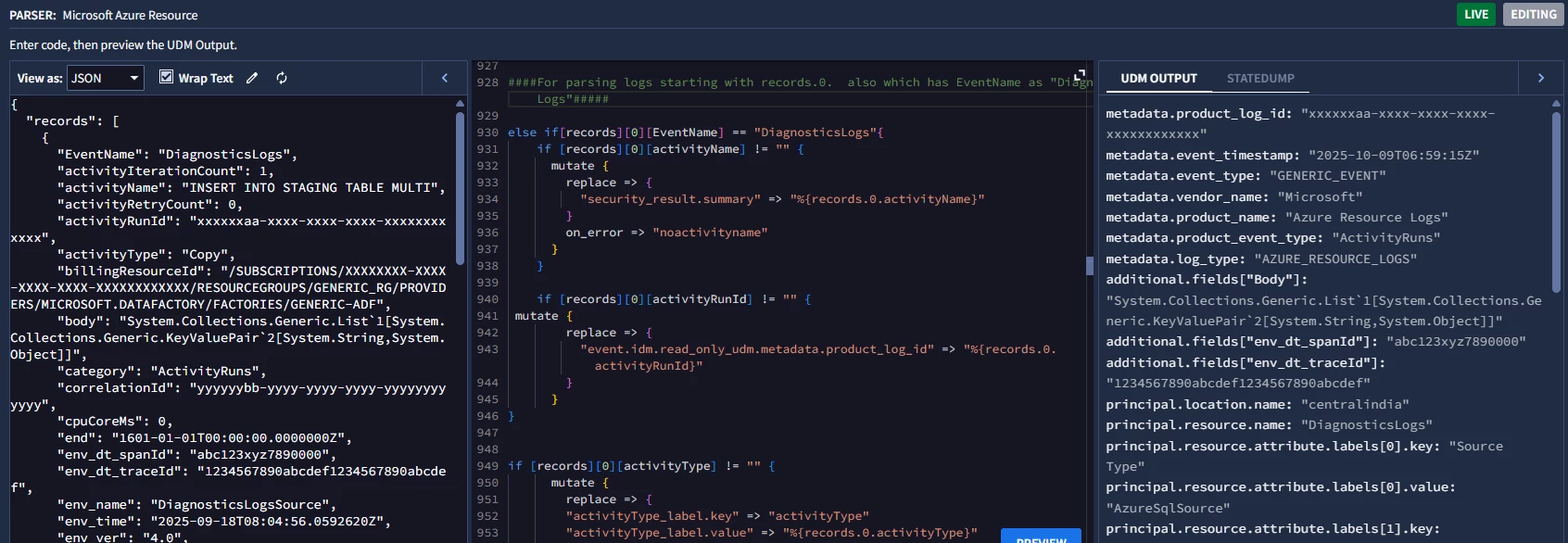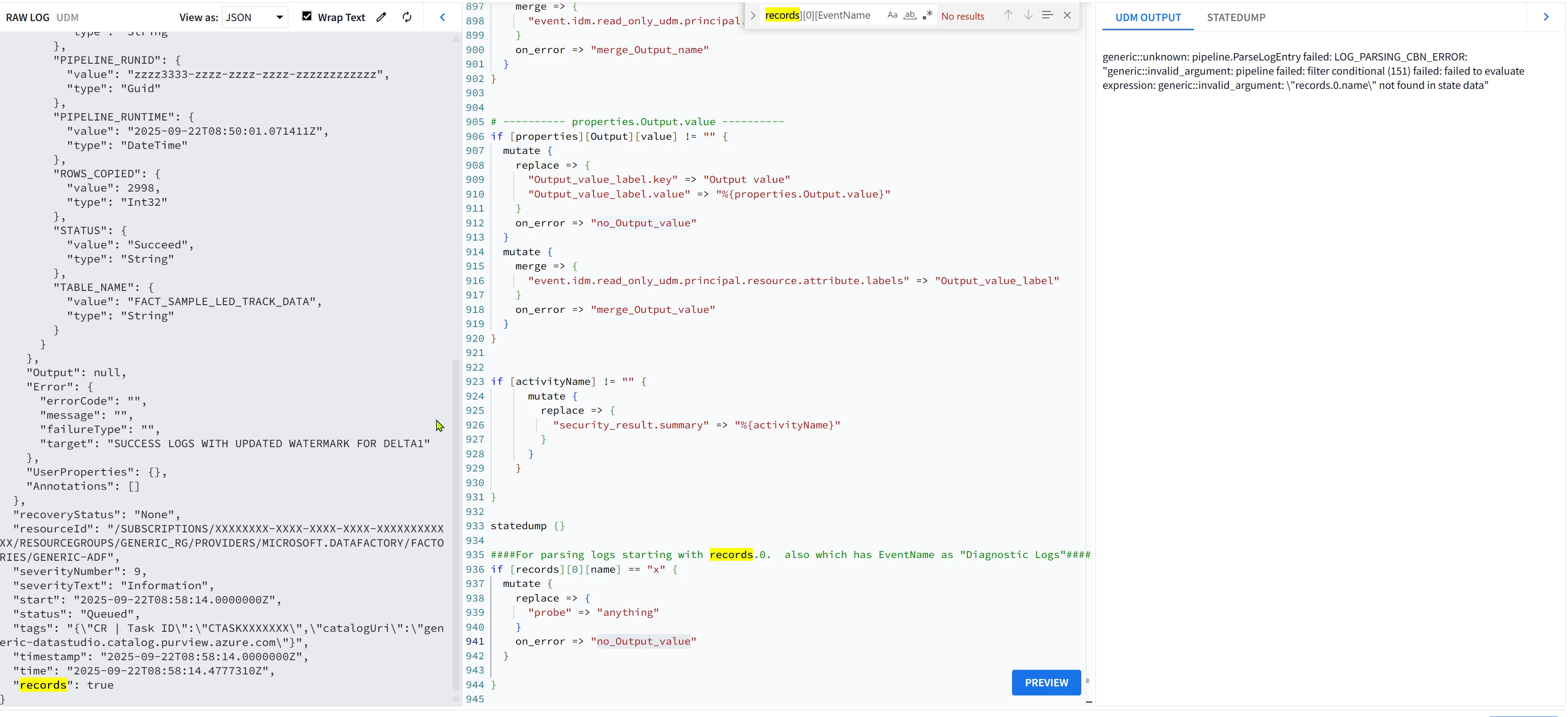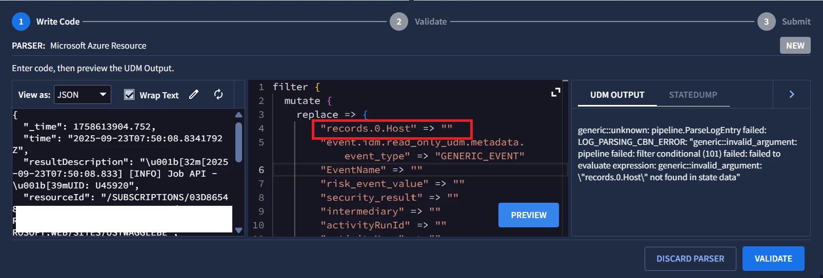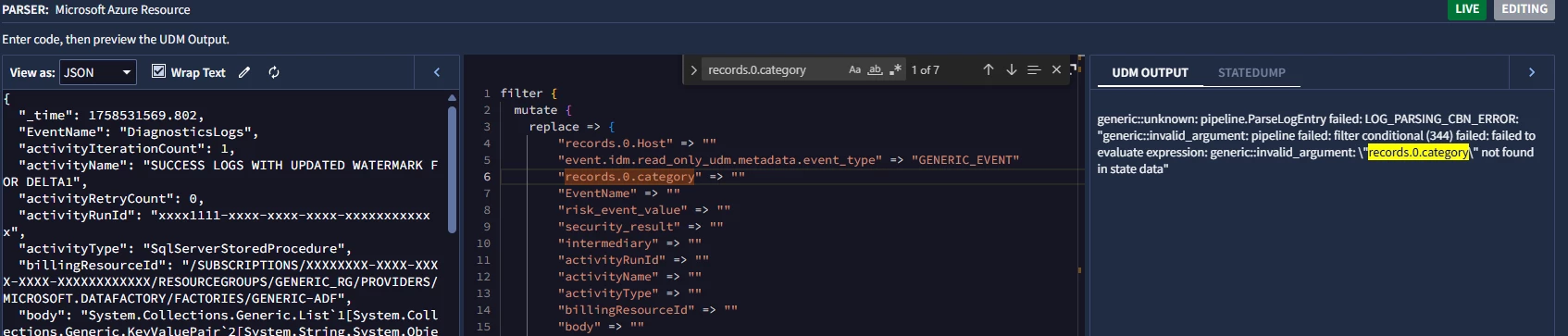 I am writing a custom parser for Microsoft Azure Resource logs. For the below raw log of category “AppServiceConsoleLogs”, I am getting the above error, even though the required field as per the error is mapped in the state data.
